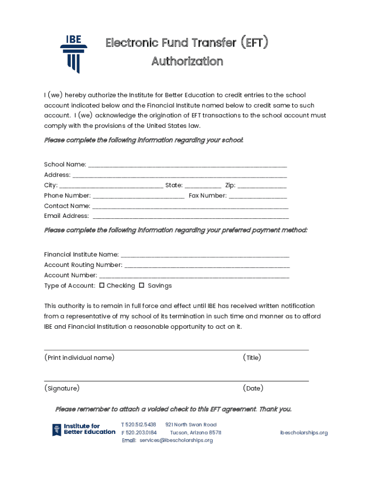 Electronic Fund Transfer (EFT) Authorization I (we) hereby authorize the Institute for Better Education to credit entries to the school account indicated below and the Financial Institute named below