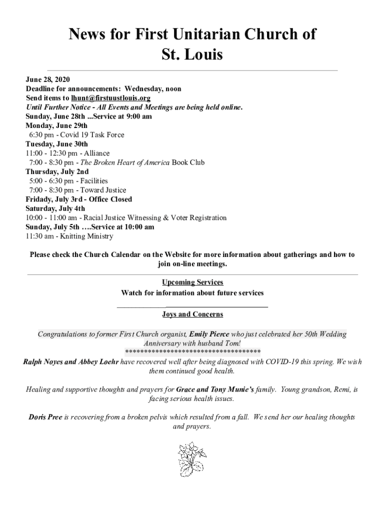 News for First Unitarian Church of St. Louis June 28, 2020, Deadline for announcements: Wednesday, noon Send items to lhunt@firstuustlouis.org Until Further Notice All Events and Meetings are being