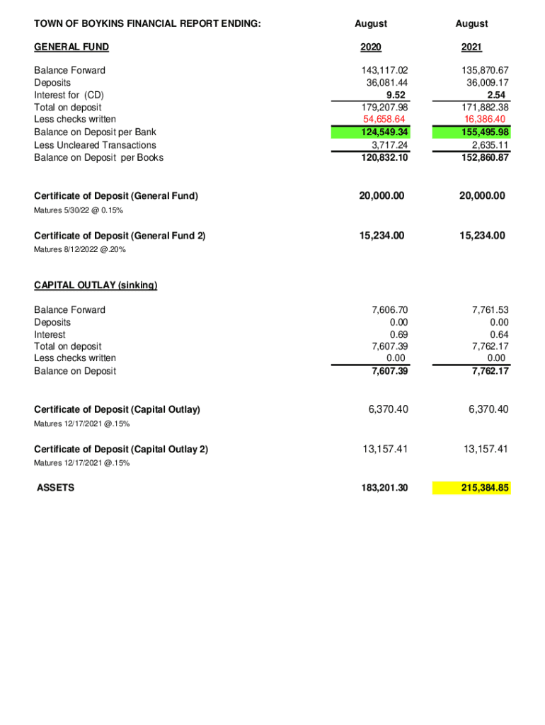 TOWN OF BODKINS FINANCIAL REPORT ENDING:AugustAugustGENERAL FUND20202021Balance Forward Deposits Interest in (CD) Total on deposit Less checks written Balance on Deposit per Bank Less Uncleared Transactions