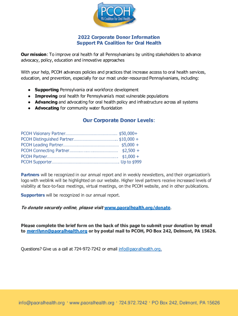2022 Corporate Donor Information Support PA Coalition for Oral Health Our mission: To improve oral health for all Pennsylvanians by uniting stakeholders to advance advocacy, policy, education and