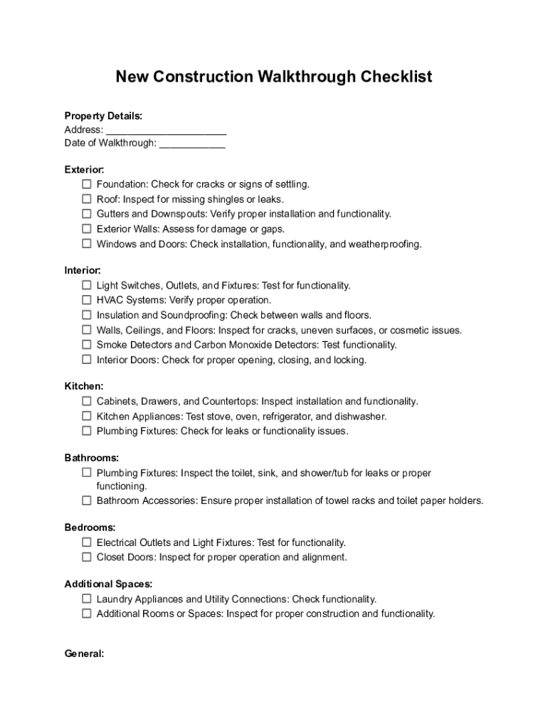 New Construction Walkthrough Checklist Property Details: Address: ___ Date of Walkthrough: ___ Exterior: Foundation: Check for cracks or signs of settling. Roof: Inspect for missing shingles or leaks.