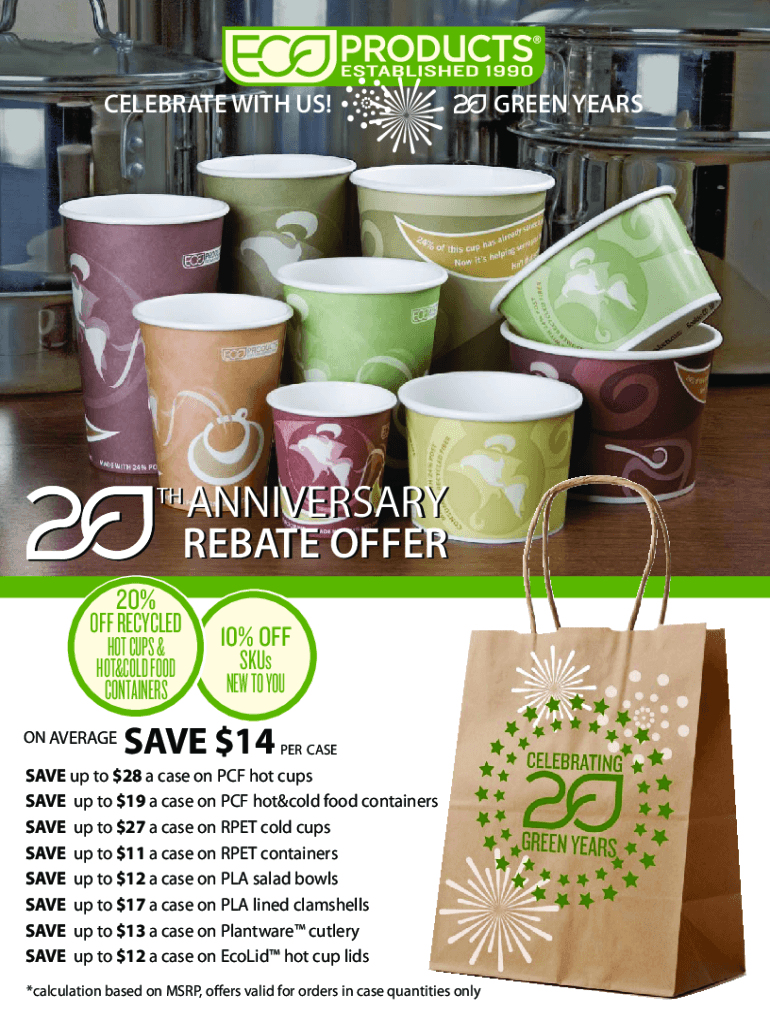 CELEBRATE WITH US!ANNIVERSARY REBATE OFFERTH20% OFF RECYCLED HOT CUPS & COTSWOLD FOOD CONTAINERS ON AVERAGE10% OFF SKUs NEW TO YOUS AVE $14PER CASES AVE up to $28 a case on PCF hot cups SAVE up to