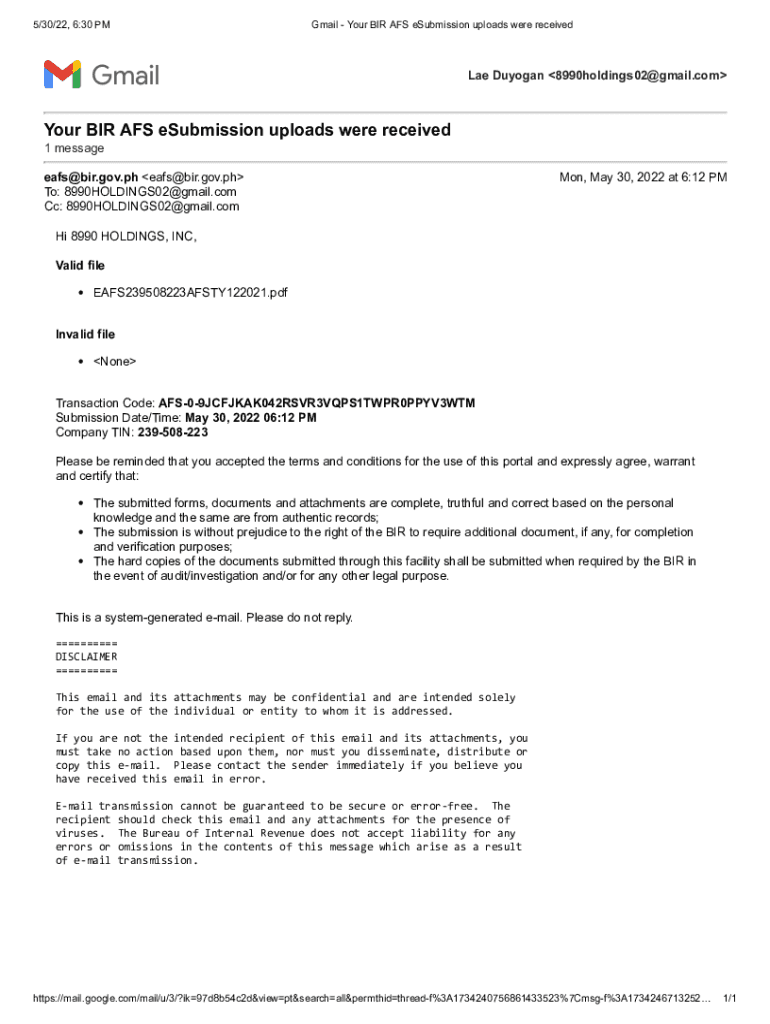 5/30/22, 6:30 PMG mail Your BIR AFS submission uploads were received Slogan 8990holdings02@gmail.comYour BIR AFS submission uploads were received1 message eafs@bir.gov.ph To: 8990HOLDINGS02@gmail.com
