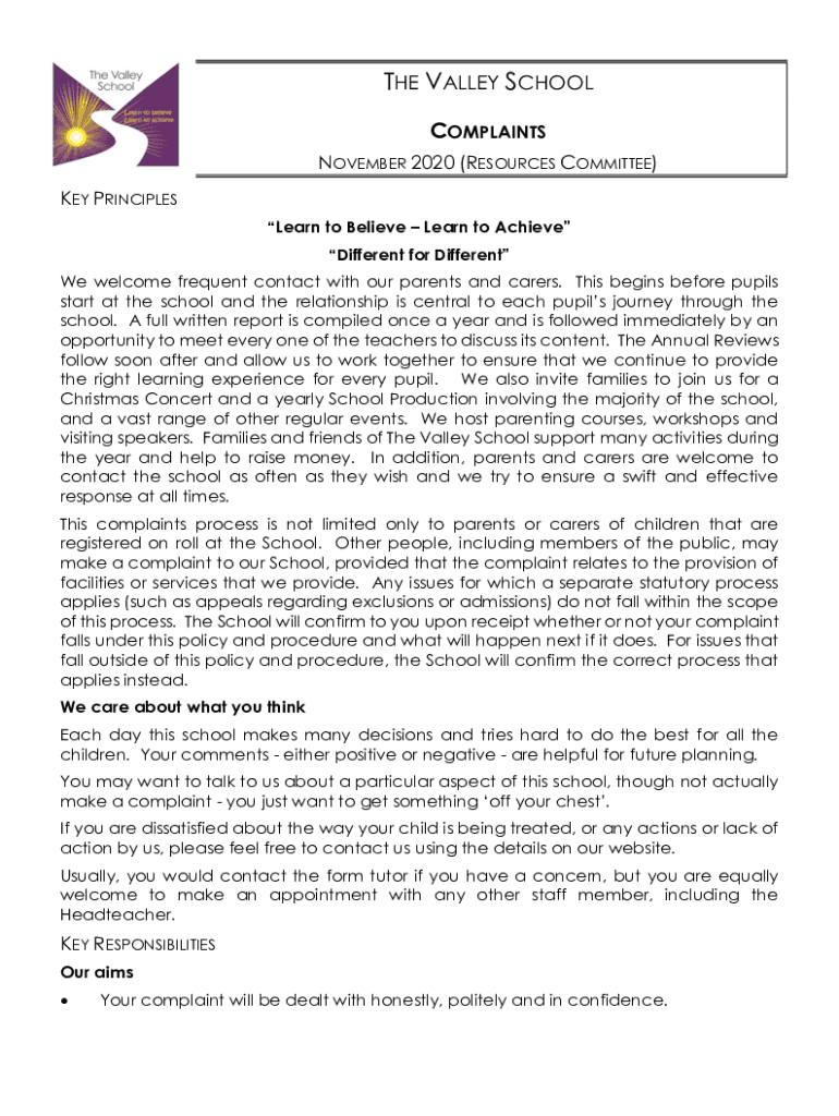 THE VALLEY SCHOOL COMPLAINTS NOVEMBER 2020 (RESOURCES COMMITTEE) KEY PRINCIPLES Learn to Believe Learn to Achieve Different for Different We welcome frequent contact with our parents and carers. This
