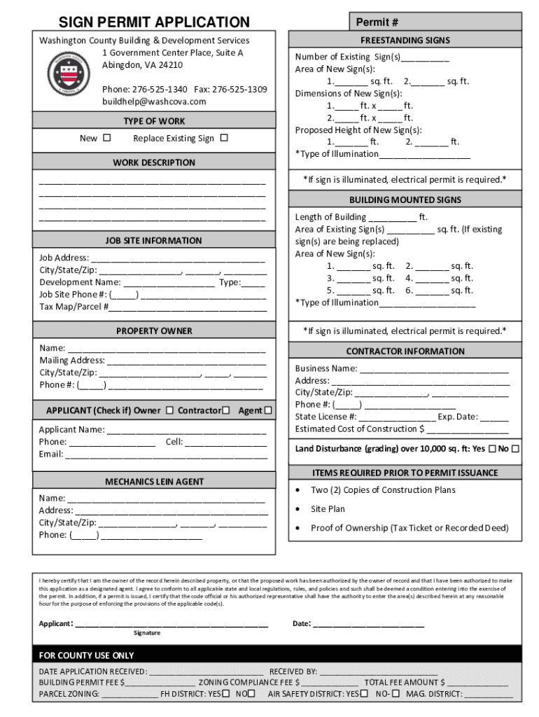 SIGN PERMIT APPLICATION Washington County Building & Development Services 1 Government Center Place, Suite A Abingdon, VA 24210 Phone: 2765251340 Fax: 2765251309 buildhelp@washcova.com TYPE OF WORK