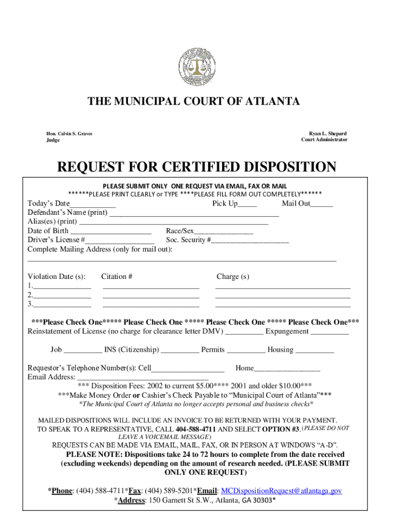 THE MUNICIPAL COURT OF ATLANTA Ryan L. Shepard Court Administrator Hon. Calvin S. GravesJudgeREQUEST FOR CERTIFIED DISPOSITION PLEASE SUBMIT ONLY ONE REQUEST VIA EMAIL, FAX OR MAIL ******PLEASE PRINT