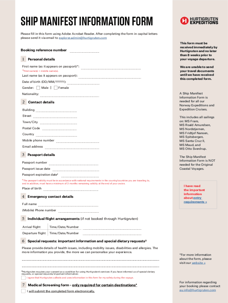 Ship Manifest Information form Please fill in this form using Adobe Acrobat Reader. After completing the form in capital letters please send it via email to explorer.admin@hurtigruten.comBooking reference