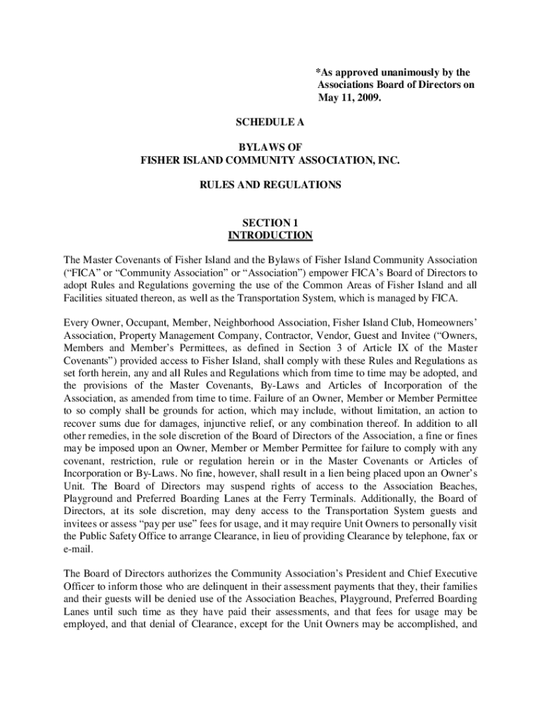 *As approved unanimously by the Associations Board of Directors on May 11, 2009. SCHEDULE A BYLAWS OF FISHER ISLAND COMMUNITY ASSOCIATION, INC. RULES AND REGULATIONSSECTION 1 INTRODUCTION The Master