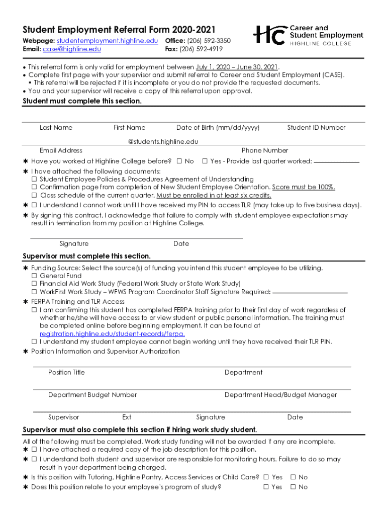 Student Employment Referral Form 20202021 Webpage: student employment. High line.edu Email: case@highline.eduOffice: (206) 5923350 Fax: (206) 5924919 This referral form is only valid for employment