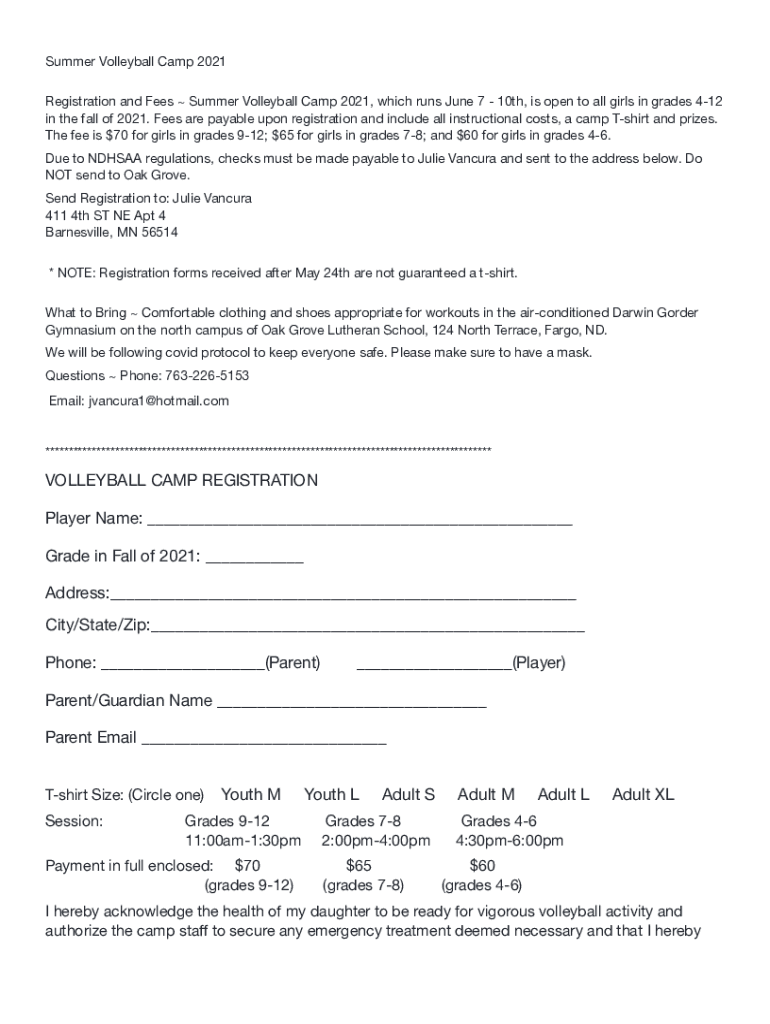Summer Volleyball Camp 2021 Registration and Fees Summer Volleyball Camp 2021, which runs June 7 10th, is open to all girls in grades 412 in the fall of 2021. Fees are payable upon registration and