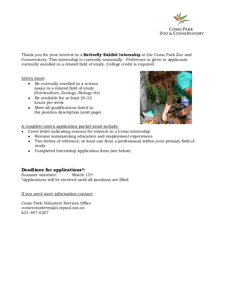 Thank you for your interest in a Butterfly Exhibit Internship at the Como Park Zoo and Conservatory. This internship is currently seasonally. Preference is given to applicants currently enrolled in