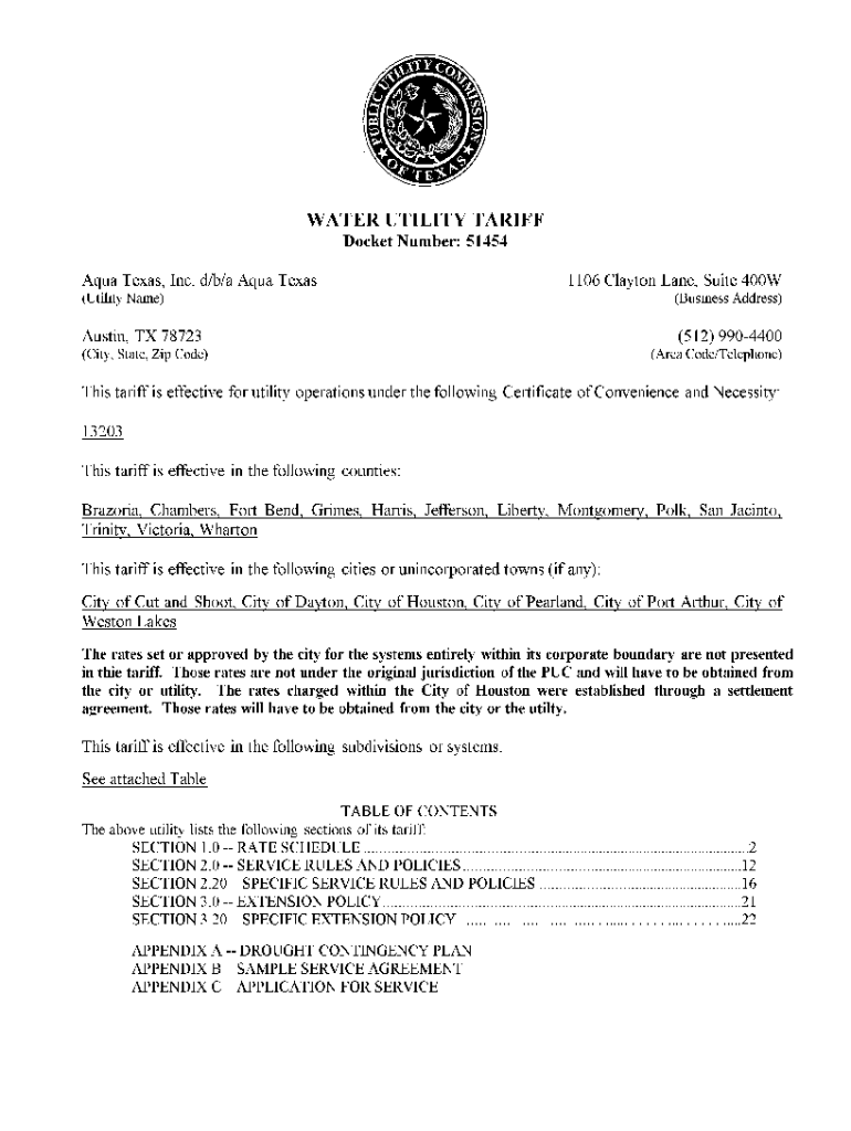 WATER UTILITY TARIFF Docket Number: 51454Aqua Texas, Inc. d/Wei Aqua Texas1106 Clayton Lane, Suite 400W(Utility Name)Austin TX 78723 (City, State, Zip Code)(Business Address)(512) 9904400 (Area Code/Telephone)This