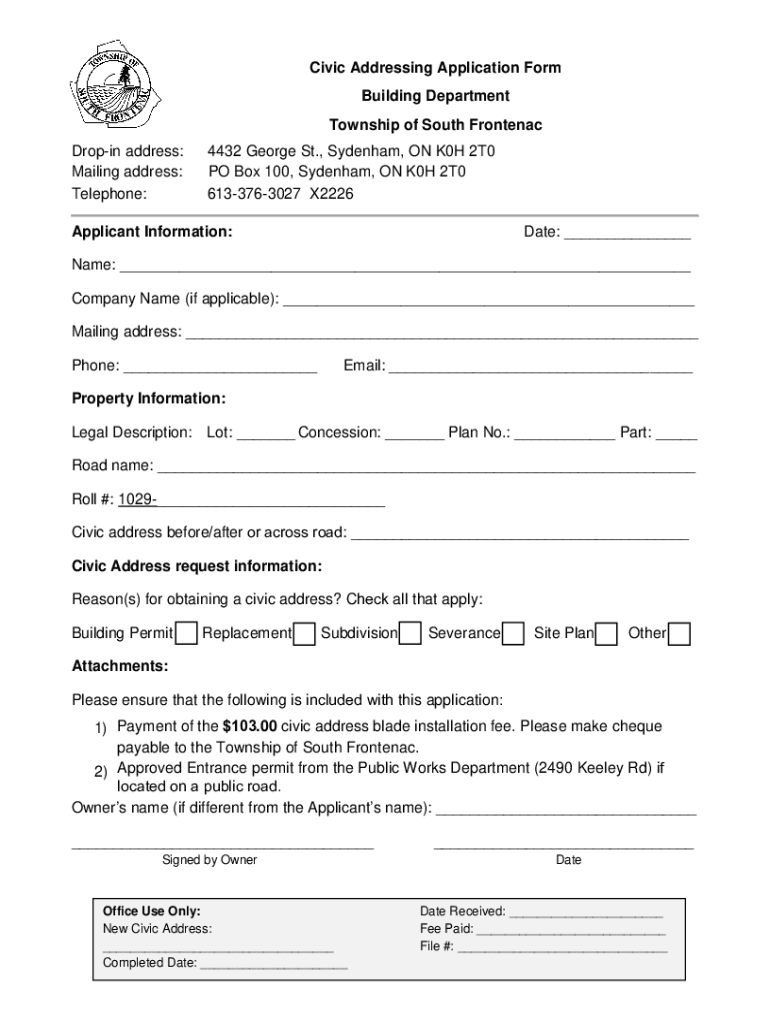 Civic Addressing Application Form Building Department Township of South Frontenac Drop in address: Mailing address: Telephone:4432 George St., Dagenham, ON K0H 2T0 PO Box 100, Dagenham, ON K0H 2T0