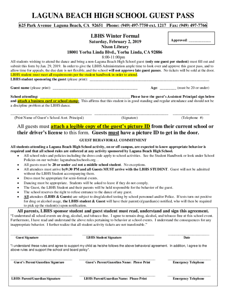 LAGUNA BEACH HIGH SCHOOL GUEST PASS 625 Park Avenue Laguna Beach, CA 92651 Phone: (949) 4977750 ext. 1217 Fax: (949) 4977766LBHS Winter FormalApproved: ___Saturday, February 2, 2019, Nixon Library