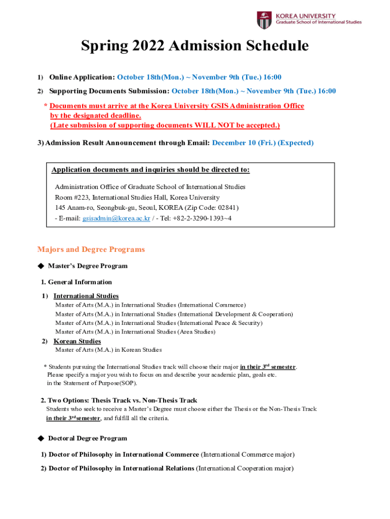 Spring 2022 Admission Schedule 1) Online Application: October 18th(Mon.) November 9th (Tue.) 16:00 2) Supporting Documents Submission: October 18th(Mon.) November 9th (Tue.) 16:00* Documents must