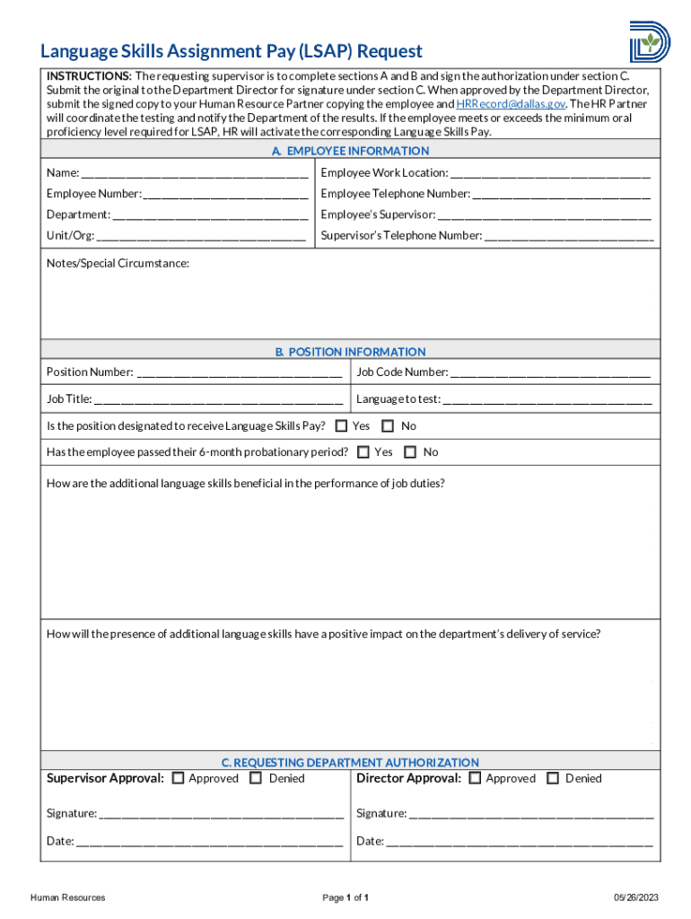 Language Skills Assignment Pay (LAP) Request INSTRUCTIONS: The requesting supervisor is to complete sections A and B and sign the authorization under section C. Submit the original to the Department