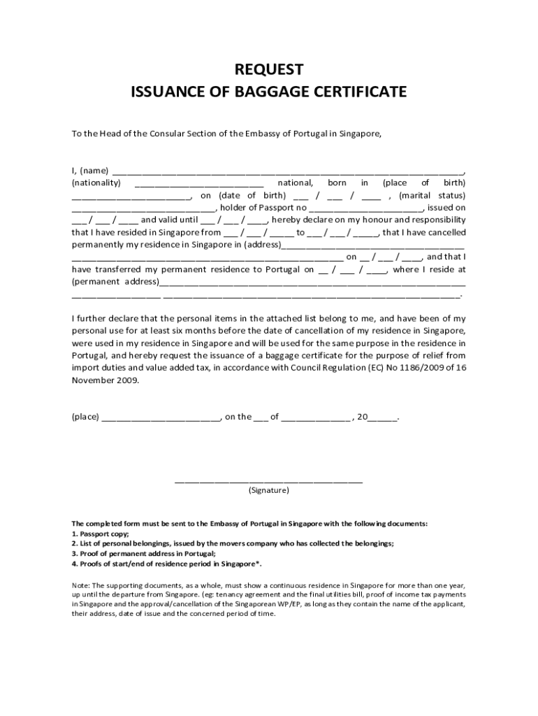 REQUEST ISSUANCE OF BAGGAGE CERTIFICATE To the Head of the Consular Section of the Embassy of Portugal in Singapore, I, (name) ___, (nationality) ___ national, born in (place of birth) ___, on (date