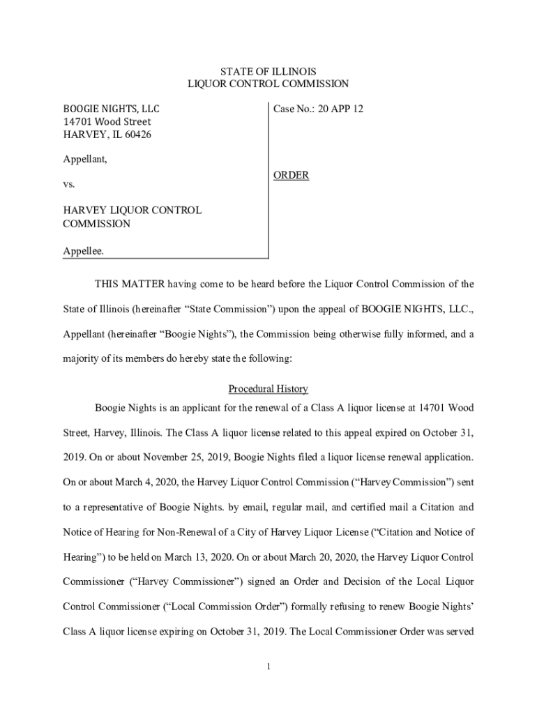 STATE OF ILLINOIS LIQUOR CONTROL COMMISSION Case No.: 20 APP 12BOOGIE NIGHTS, LLC 14701 Wood Street HARVEY, IL 60426 Appellant, Orders. HARVEY LIQUOR CONTROL COMMISSION Appealed. THIS MATTER having