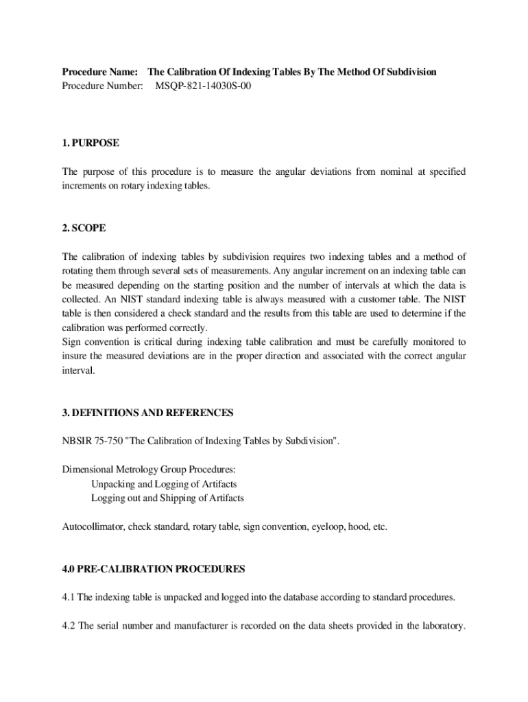 Procedure Name: The Calibration Of Indexing Tables By The Method Of Subdivision Procedure Number: MSQP82114030S001. PURPOSE The purpose of this procedure is to measure the angular deviations from
