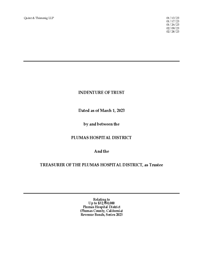 Quint & Trimming LLP01/13/23 01/17/23 01/26/23 02/09/23 02/28/23INDENTURE OF Frustrated as of March 1, 2023, by and between the PLUMES HOSPITAL DISTRICT And the TREASURER OF THE PLUMES HOSPITAL DISTRICT,