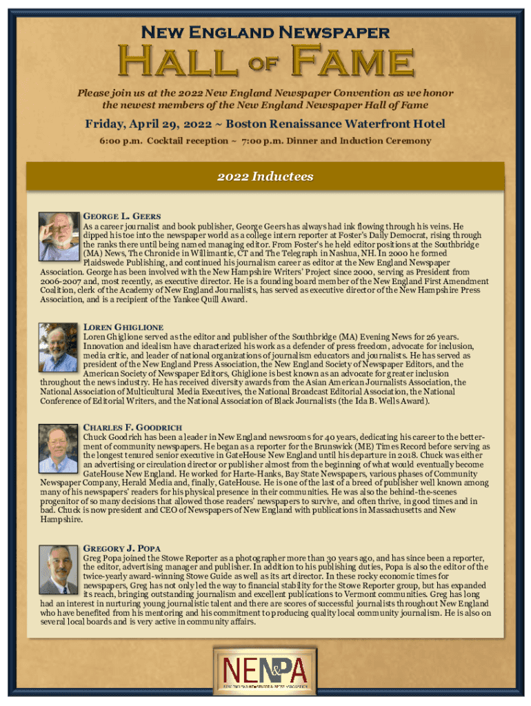 Please join us at the 2022 New England Newspaper Convention as we honor the newest members of the New England Newspaper Hall of Fame Friday, April 29, 2022, Boston Renaissance Waterfront Hotel 6:00