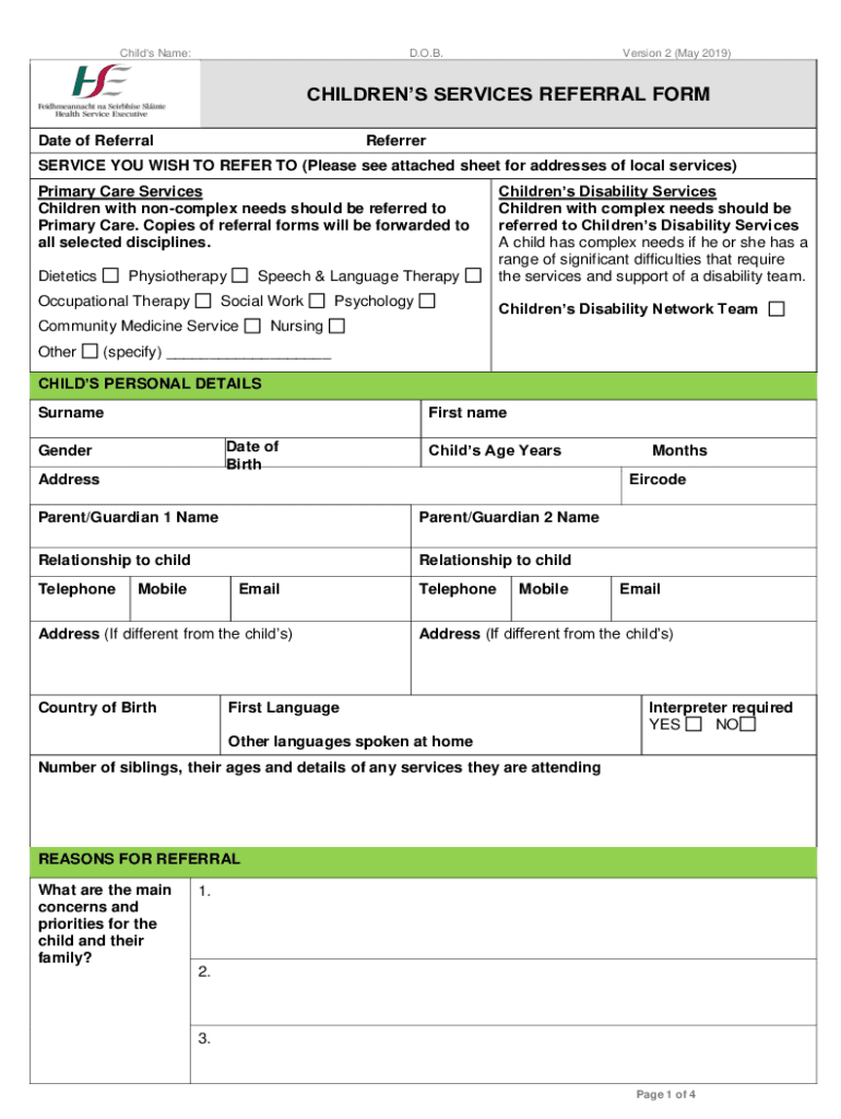 Get the free Referral Form for Dublin South West Children's Service