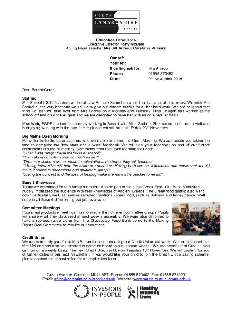 Education Resources Executive Director Tony McDaid Acting Head Teacher Mrs Jill Armour Car stairs Primary Our ref: Your ref: If calling ask for: Phone: Date:Mrs Armour 01555 870462 2nd November 2018Dear