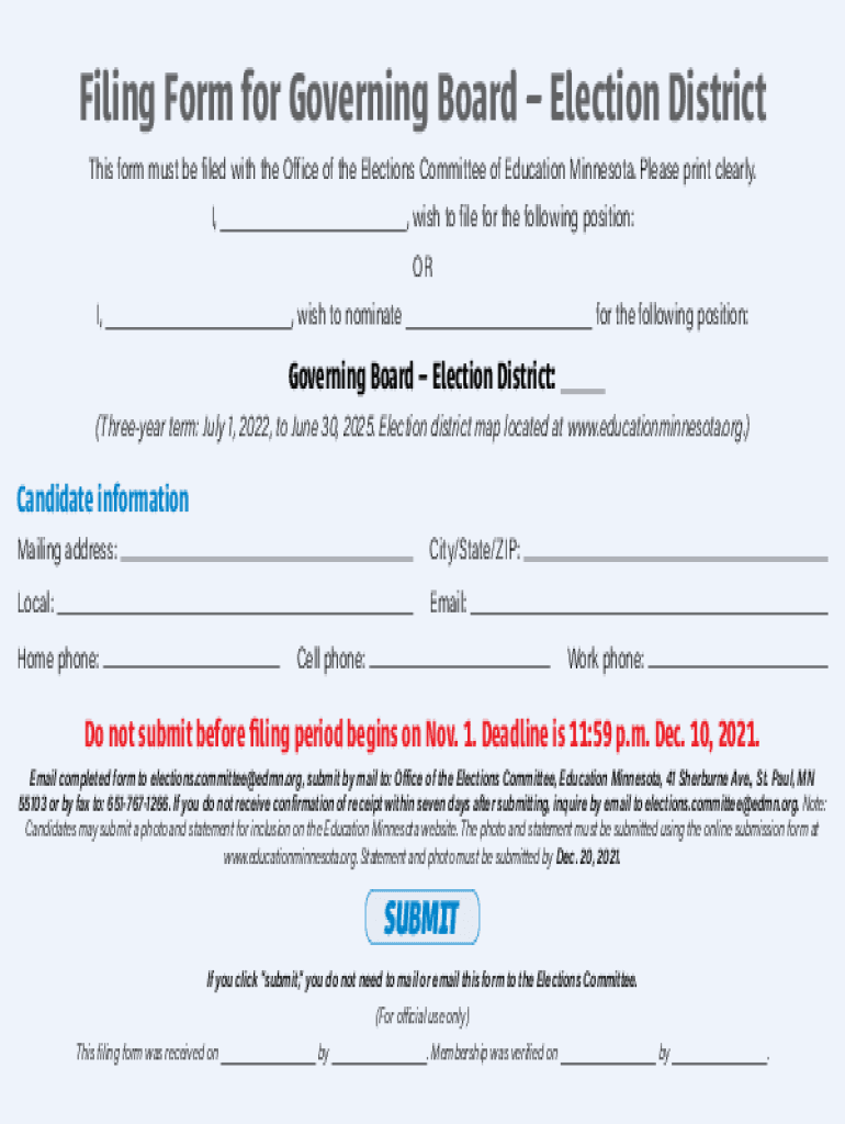 Filing Form for Governing Board Election District This form must be filed with the Office of the Elections Committee of Education Minnesota. Please print clearly. I, wish to file for the following