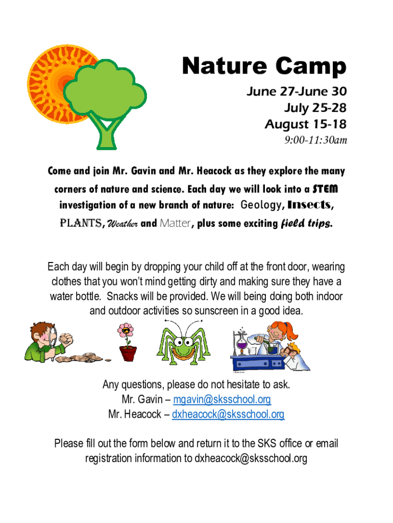 Nature Camp June 27June 30 July 2528 August 1518 9:0011:30am Come and join Mr. Gavin and Mr. Peacock as they explore the many corners of nature and science. Each day we will look into a STEM investigation
