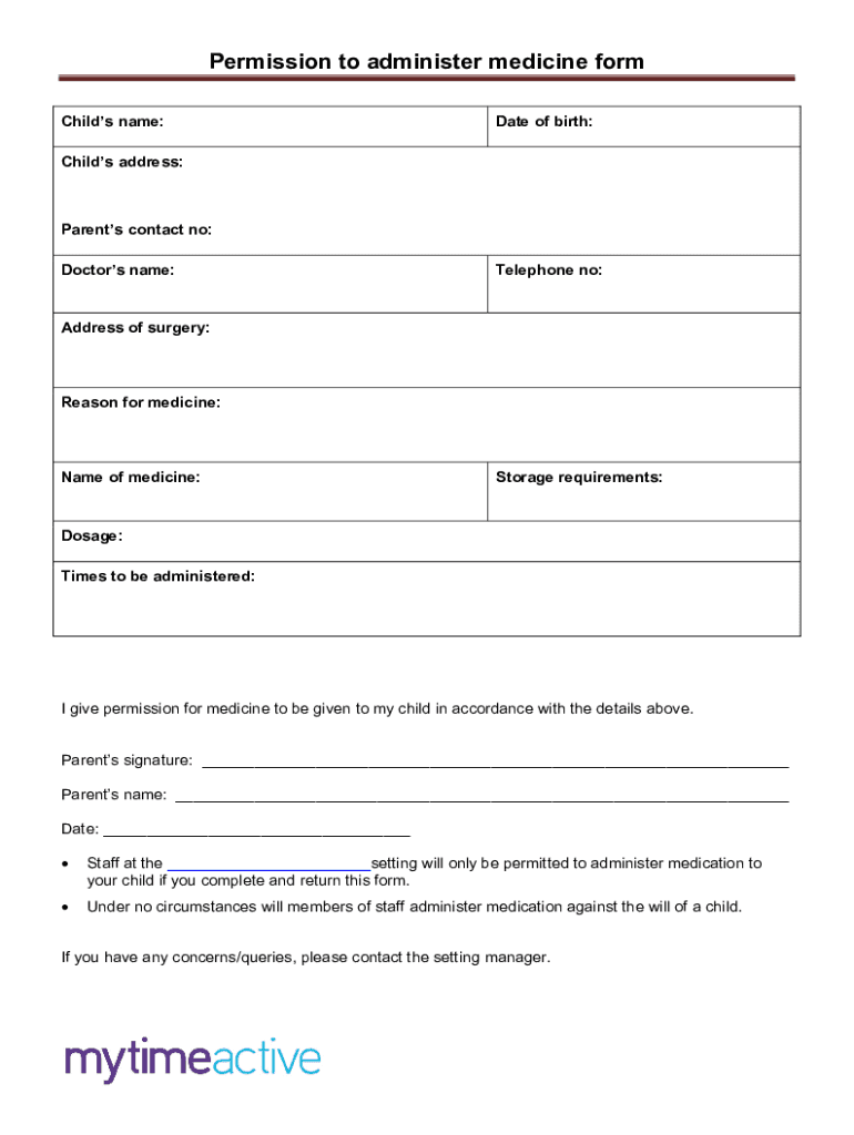 Permission to administer medicine form Child's name:Date of birth:Child's address:Parents contact no: Doctors name:Telephone no:Address of surgery:Reason for medicine:Name of medicine:Storage requirements:Dosage:
