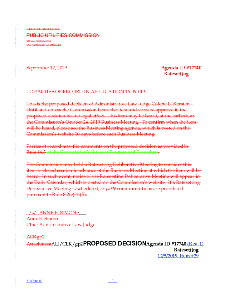 SAN FRANCISCO, CA 941023298September 12, 2019Agenda ID #17740