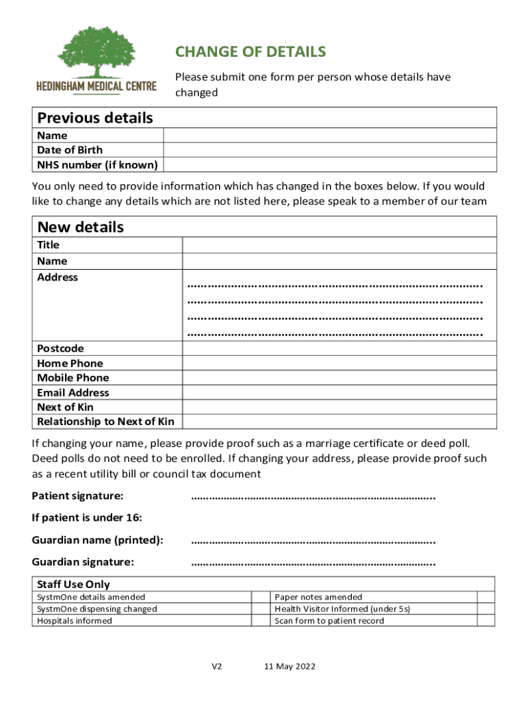 CHANGE OF DETAILS Please submit one form per person whose details have changedPrevious details Name Date of Birth NHS number (if known) You only need to provide information which has changed in the