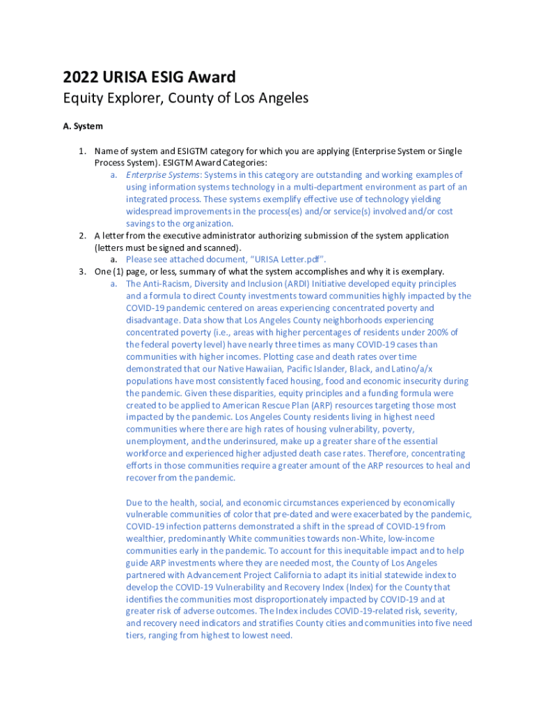 2022 URSA EIG Award Equity Explorer, County of Los Angeles A. System 1. Name of system and ESI GTM category for which you are applying (Enterprise System or Single Process System). ESI GTM Award Categories: