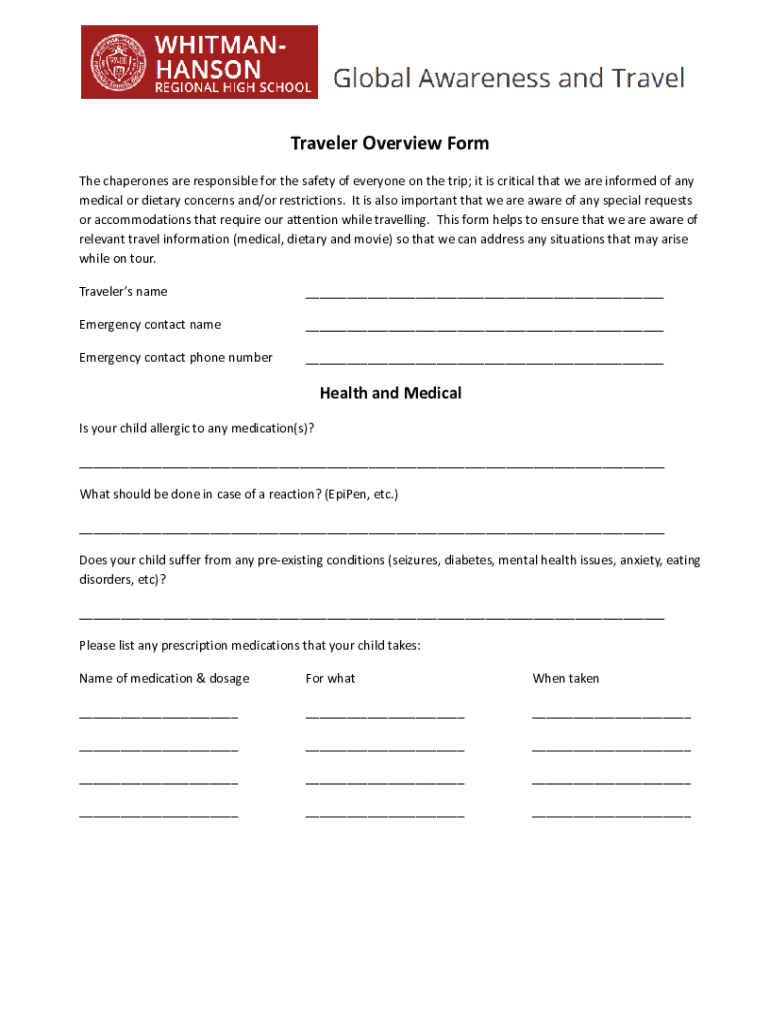 Traveler Overview Form The chaperones are responsible for the safety of everyone on the trip; it is critical that we are informed of any medical or dietary concerns and/or restrictions. It is also