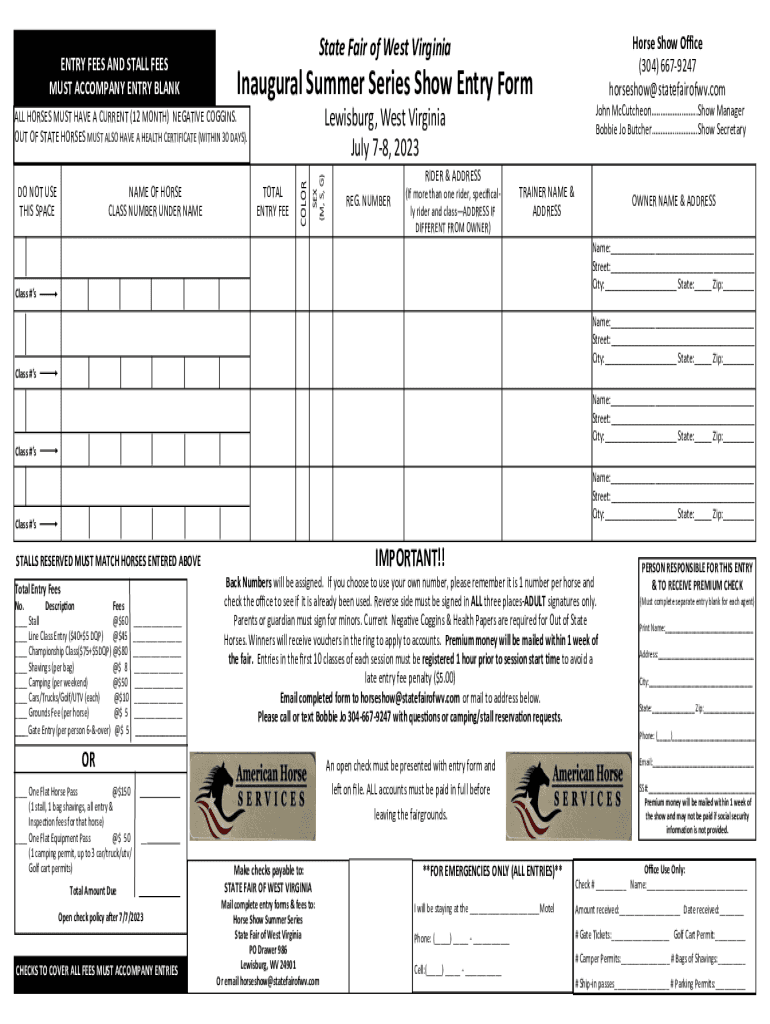 ENTRY FEES AND STALL FEES MUST ACCOMPANY ENTRY BLANKInaugural Summer Series Show Entry Form Lewis burg, West Virginia July 78, 2023 TOTAL ENTRY FEE SEX (M, S, G)NAME OF HORSE CLASS NUMBER UNDER NAMECOLORALL