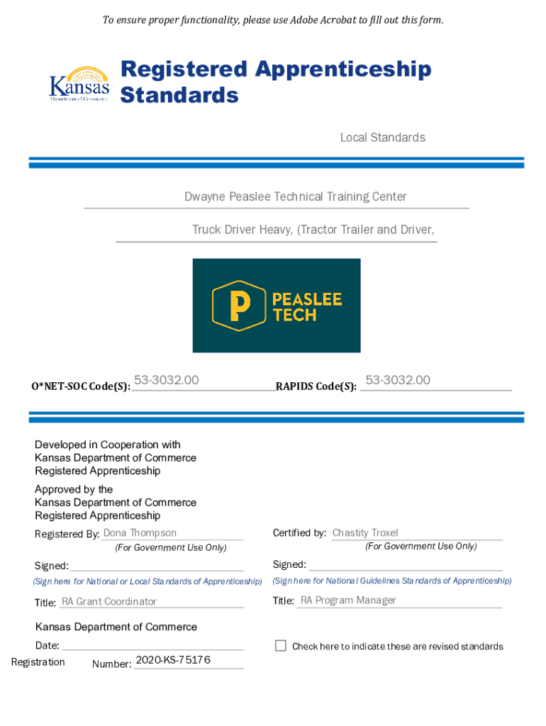 To ensure proper functionality, please use Adobe Acrobat to fill out this form. Registered Apprenticeship Standards Local Standards Dwayne Peas lee Technical Training Cybertruck Driver Heavy, (Tractor