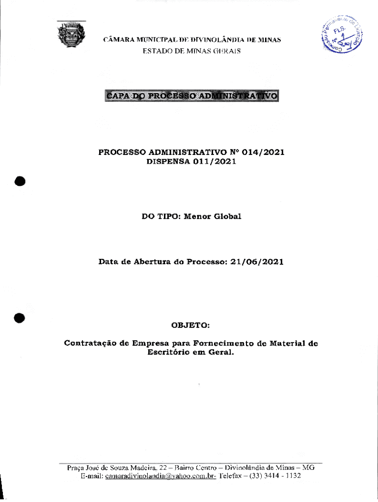 CLARA MUNICIPAL DE DIVINOLNDIA DE MINES ESTATE DE MINES GERAISPROCESSO ADMINISTRATIVE N 014/2021 DISPENSE 011/2021DO TIP: Minor Global. Data de Abertura do Process: 21/06/2021OBJETO: Contralto de