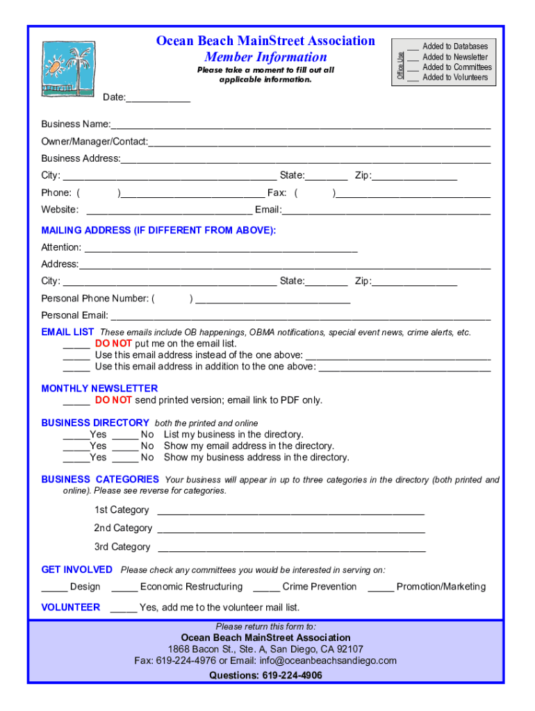 Please take a moment to fill out all applicable information. Office Ocean Beach Mainstream Association Member Information___ ___ ___ ___Added to Databases Added to Newsletter Added to Committees Added