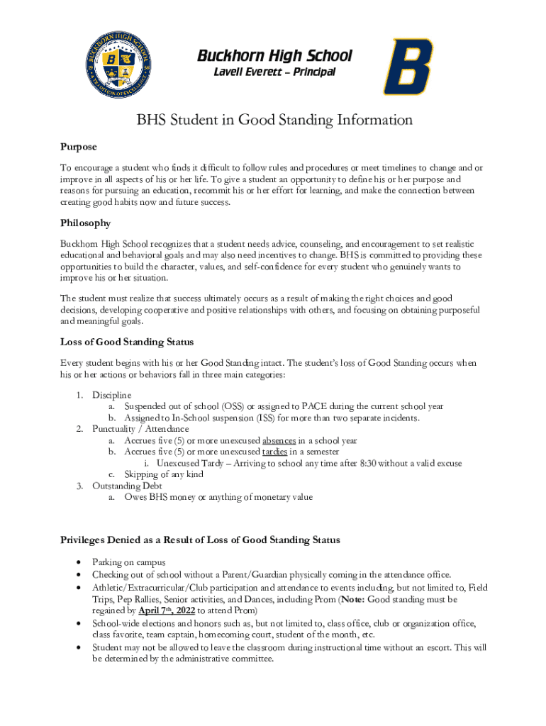 Buck horn High School Lav ell Everett Principal BHS Student in Good Standing Information Purpose To encourage a student who finds it difficult to follow rules and procedures or meet timelines to change