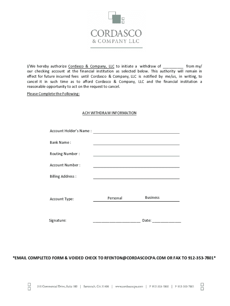 I/We hereby authorize Carrasco & Company, LLC to initiate a withdrawal of ___ from my/ our checking account at the financial institution as selected below. This authority will remain in effect for