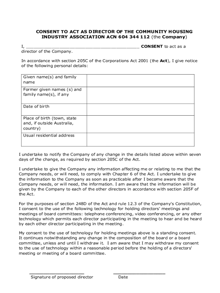 CONSENT TO ACT AS DIRECTOR OF THE COMMUNITY HOUSING INDUSTRY ASSOCIATION ACN 604 344 112 (the Company) I, ___ CONSENT to act as a director of the Company. In accordance with section 205C of the Corporations
