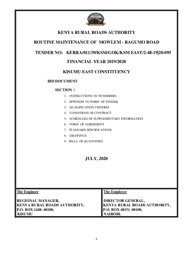 KENYA RURAL ROADS AUTHORITY ROUTINE MAINTENANCE OF MOW LEM BAGUIO ROAD TENDER NO: KERRY/011/39/KSM/GO/KSM EAST/24819|20095 FINANCIAL YEAR 2019/2020 ISUZU EAST CONSTITUENCY BID DOCUMENT SECTION 1:
