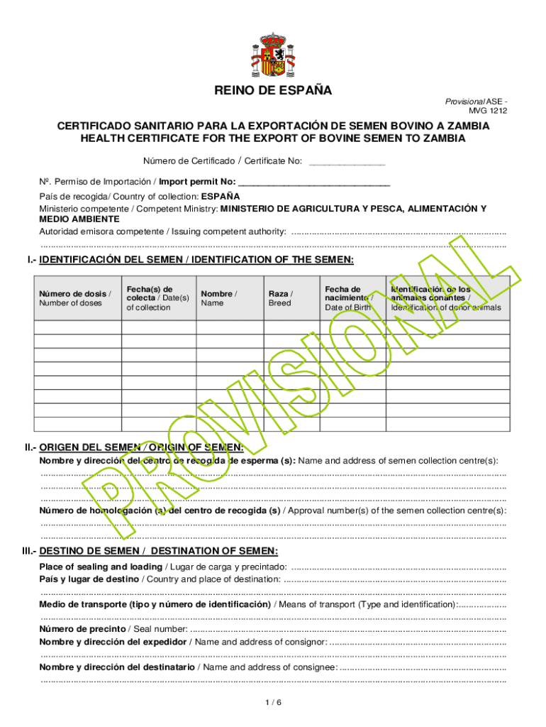 Provisional ASE MVP 1212CERTIFICADO SANITATION PARA LA EXPORTATION DE SEMEN BOVINE A ZAMBIA