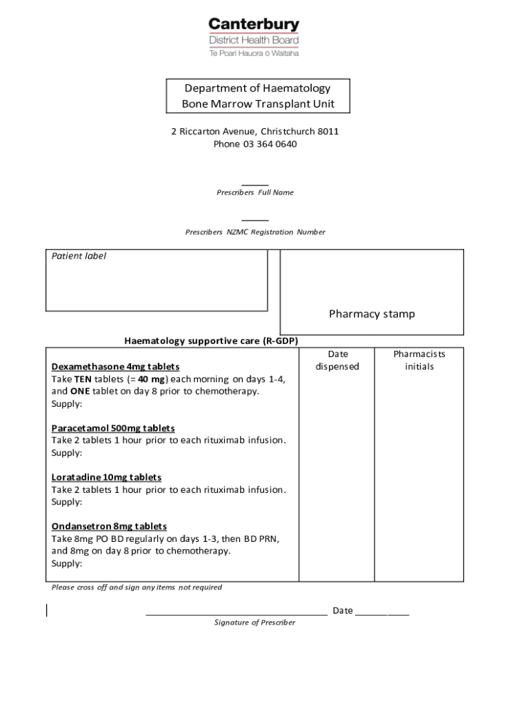 Department of Hematology Bone Marrow Transplant Unit 2 Riccardo Avenue, Christchurch 8011 Phone 03 364 0640Prescribers Full NamePrescribers NAMC Registration NumberPatient labelPharmacy stamp Hematology