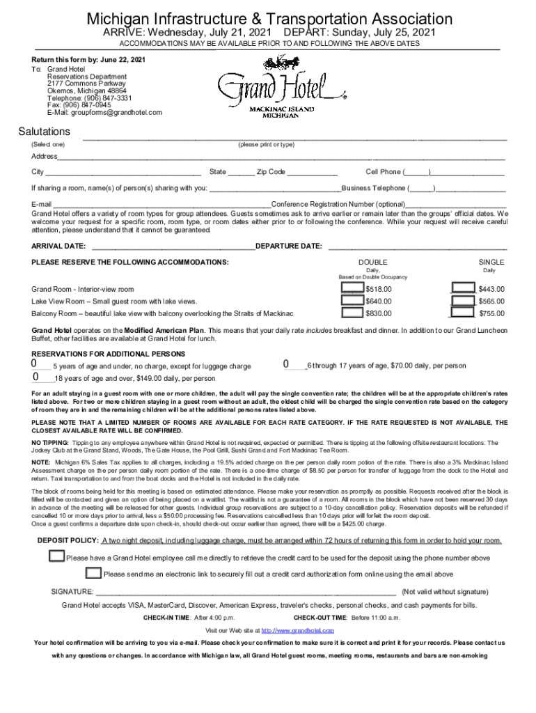 2021 MTA Summer ConferenceGrand Hotel Mackinac Island July 2225, 2021scheduleHotel checking is 4:00 PM and checkout is 11:00 am Thursday, July 22, 202110:00 AM 6:00 pm 7:00 golf at The Jewel Welcome