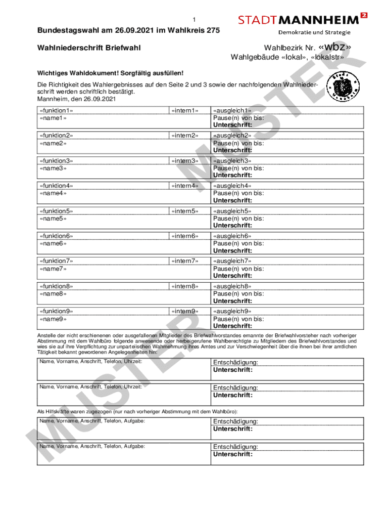 1Bundestagswahl am 26.09.2021 I'm Walkers 275 Wahlbezirk NR. wiz Wahlgebude local, lokalstrWahlniederschrift BriefwahlWichtiges Wahldokument! Sorgfltig Allen! Die Richtigkeit DES Wahlergebnisses AUF