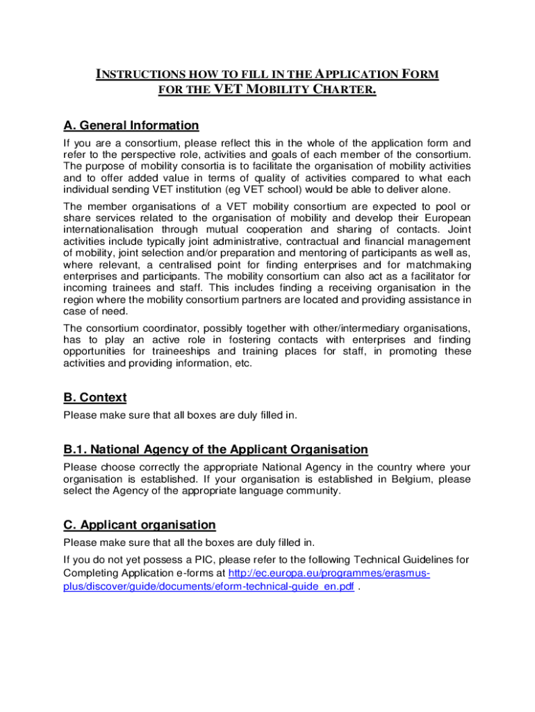 INSTRUCTIONS HOW TO FILL IN THE APPLICATION FORM FOR THE VET MOBILITY CHARTER. A. General Information If you are a consortium, please reflect this in the whole of the application form and refer to