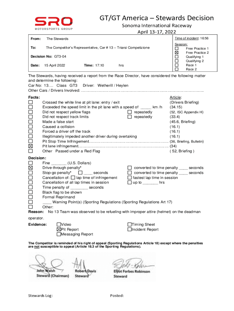 GT/GT America Stewards Decision Sonoma International Raceway April 1317, 2022 Time of incident: 16:56From:The Stewards:The Competitors Representative, Car # 13 Trials CompetizioneDecision No: GT304