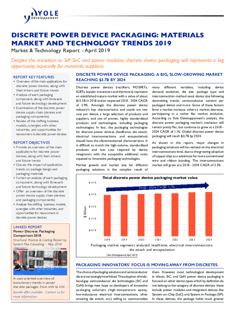 DISCRETE POWER DEVICE PACKAGING: MATERIALS MARKET AND TECHNOLOGY TRENDS 2019 Market & Technology Report April 2019Despite the transition to Sip, SoC and power modules, discrete device packaging still