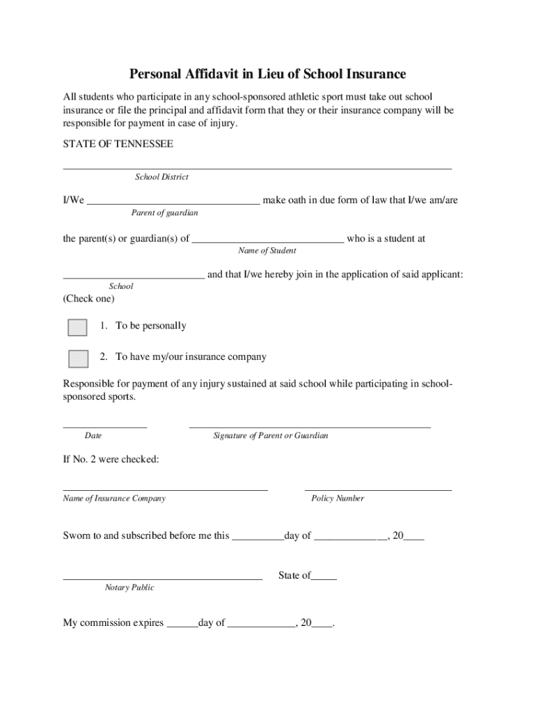 Personal Affidavit in Lieu of School Insurance All students who participate in any school sponsored athletic sport must take out school insurance or file the principal and affidavit form that they